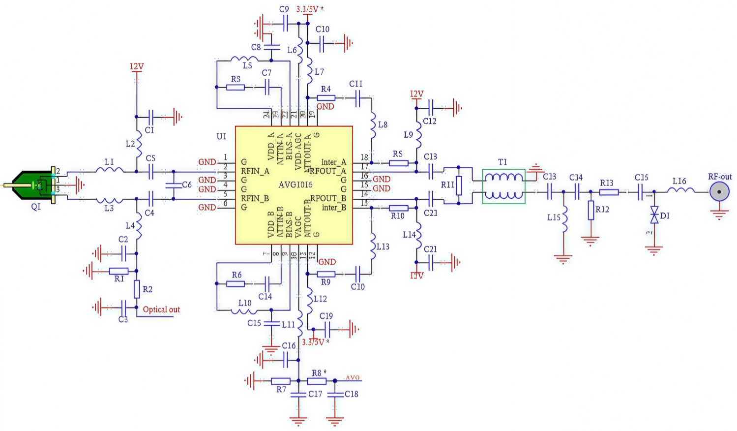 إن AVG1016 من Sanland عبارة عن مضخم صوت متغير مزود بـ مخفف الجهد المتحكم فيه. مكبر للصوت لديه عالية الخطية وانخفاض مستوى الضجيج الذي تم تحقيقه باستخدام 0.5um عملية GaAs E-pHEMT. يقع في نموذج مصغر 4.0x حزمة 4.0 مم ذات 24 سنًا رباعية مسطحة غير الرصاص (QFN). إنها مصممة للاستخدام الأمثل من 45 ميجا هرتز إلى 1000 ميجا هرتز. البصمة المدمجة والملف الشخصي المنخفض مقترنًا بالارتفاع الكسب والخطية العالية تجعل من AVG1018 خيارًا مثاليًا كمضخم لشبكة CATV وشبكة FTTH.